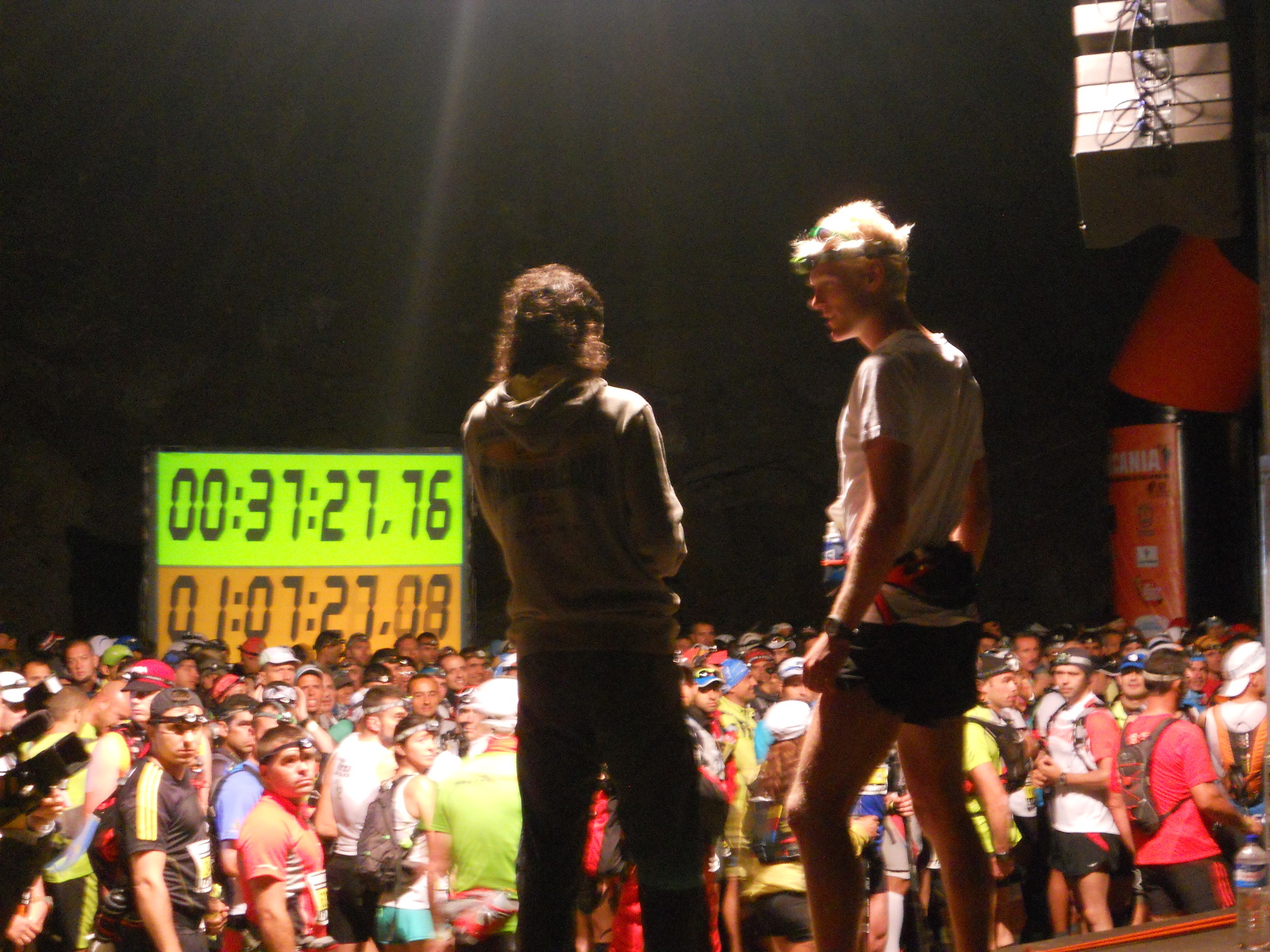 une ambiance incroyable, de la musique Ă fond, et des centaines de coureurs venus principalement des Canaries, prĂȘts Ă en dĂ©coudre avec le relief de La Palma. A 6h, le dĂ©part est lancĂ©e par la âprĂ©sidenteâ de lâĂźle, et câest alors un Ă©norme cordon de lumiĂšres rouges et blanches qui sâĂ©lance. Pour moi sans doute la plus belle image de cette course. Quelques photos dâun autre blog.