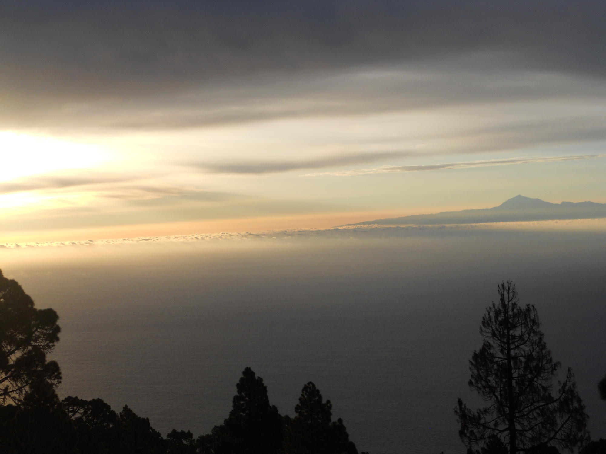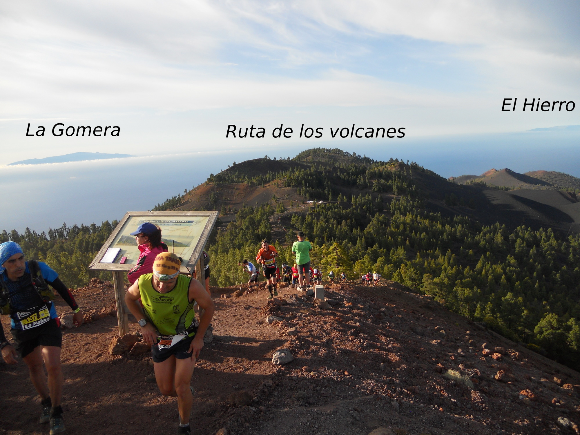 Une montĂ©e interminable dans les graviers volcaniques (excellent pour lâamortie, mais hard pour les mollets), et un levĂ© de soleil de toute beautĂ©, avec les silhouettes de Tenerife et la Gomera Ă lâest, et de El Hierro au sud. Je regrettais de ne pas avoir mon appareil reflex sur moi, car les rĂ©sultats avec le compact sont un peu pourris. Heureusement on peut compter sur des photographes tels que Saul Santos pour immortaliser ces moments. On sâest dĂ©jĂ tapĂ© 2000 m de dĂ©nivelĂ© positif (D+ pour les habituĂ©s), et on est loin du compte.